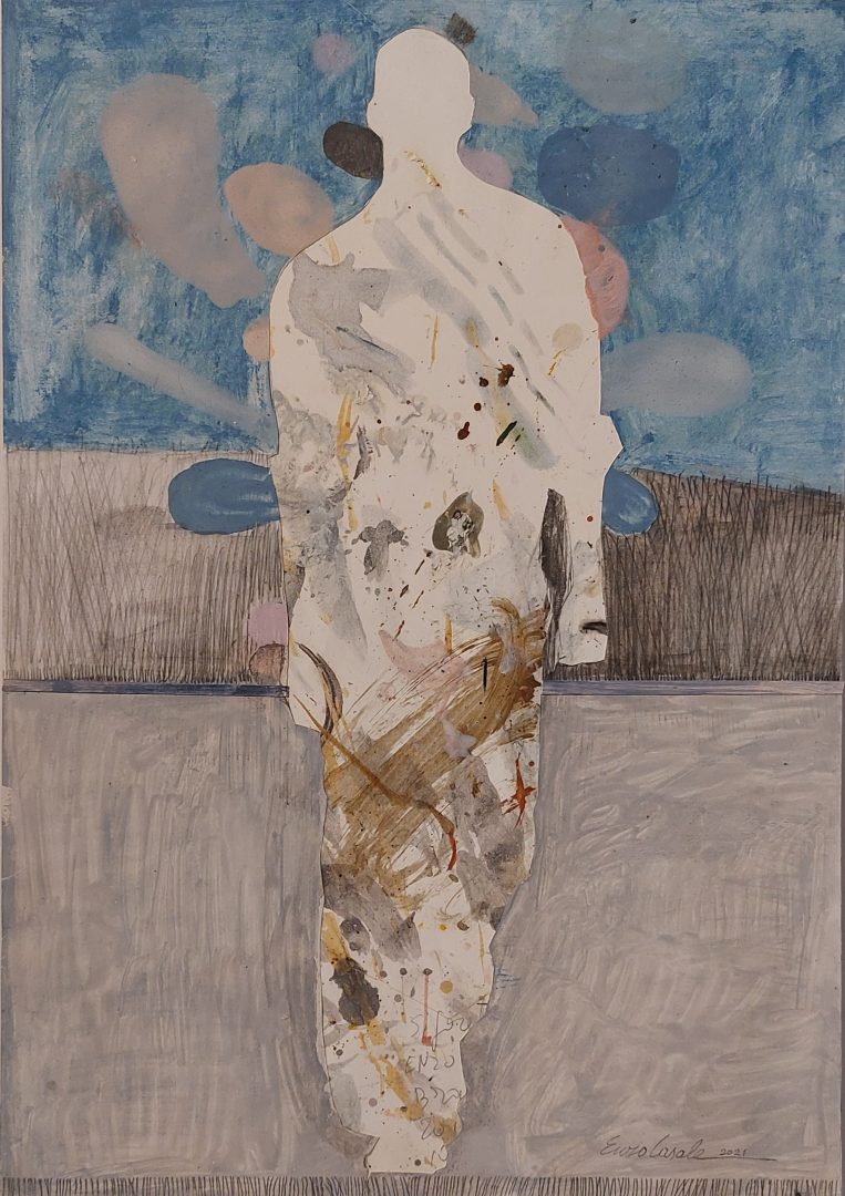 Enzo Casale concentra la sua attenzione artistica sulla figura umana, indagata nelle sue diverse sfaccettature: psicologiche, etniche, antropologiche oltreché estetiche a cui unisce la sperimentazione di colori, tessuti, tecniche che portano a diverse interpretazioni/versioni anche di una stessa figura. Ma la figura umana viene anche svuotata da Casale e di questa ne rimane solo una sagoma incombente su tutto ciò che le sta attorno, oppure la figura viene stravolta, modificata, trasformata o attraversata da griglie. A volte emerge dall’oscurità altre si sfrange nel colore e diviene eterea: in un viaggio verso un mondo fluido, senza peso, senza confini.