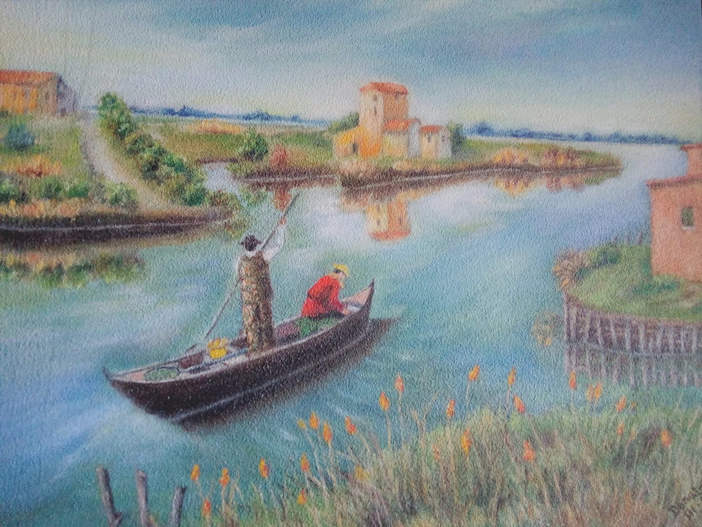 Pesca alle valli di Comacchio, 2016, Pittura olio su tela trattata con sabbia, 50 x 60 cm